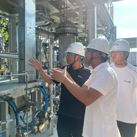 在技术人员的带领下,我校师生团队系统参观了该项目的原料气阀组、压缩系统、反应单元、中控室及分析检测中心等关键区域,深入了解了甲醇合成催化剂的研发进展与工程流程。期间,师生围绕二氧化碳资源化利用的技术瓶颈、产业化模式及人才需求等问题,与项目一线工程师展开深度交流。